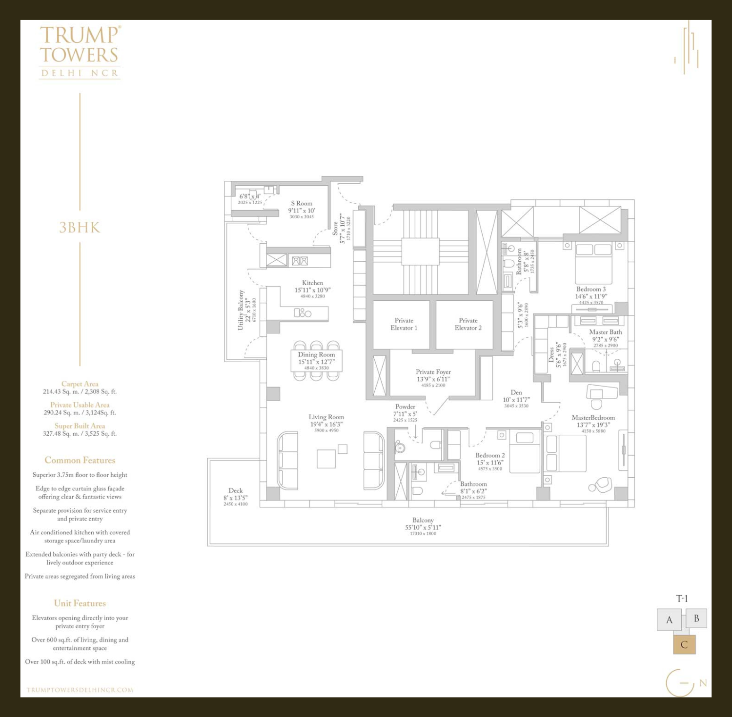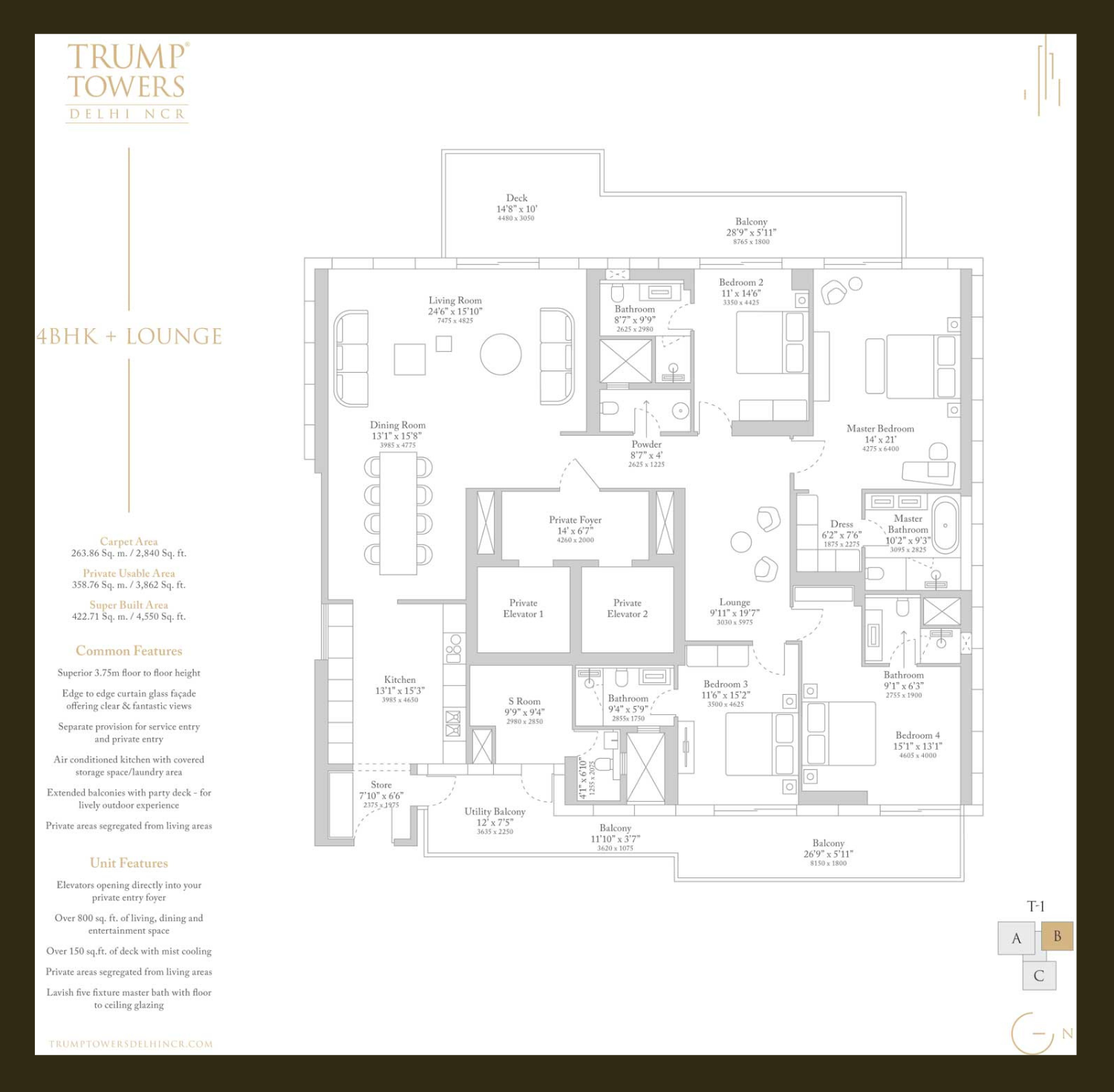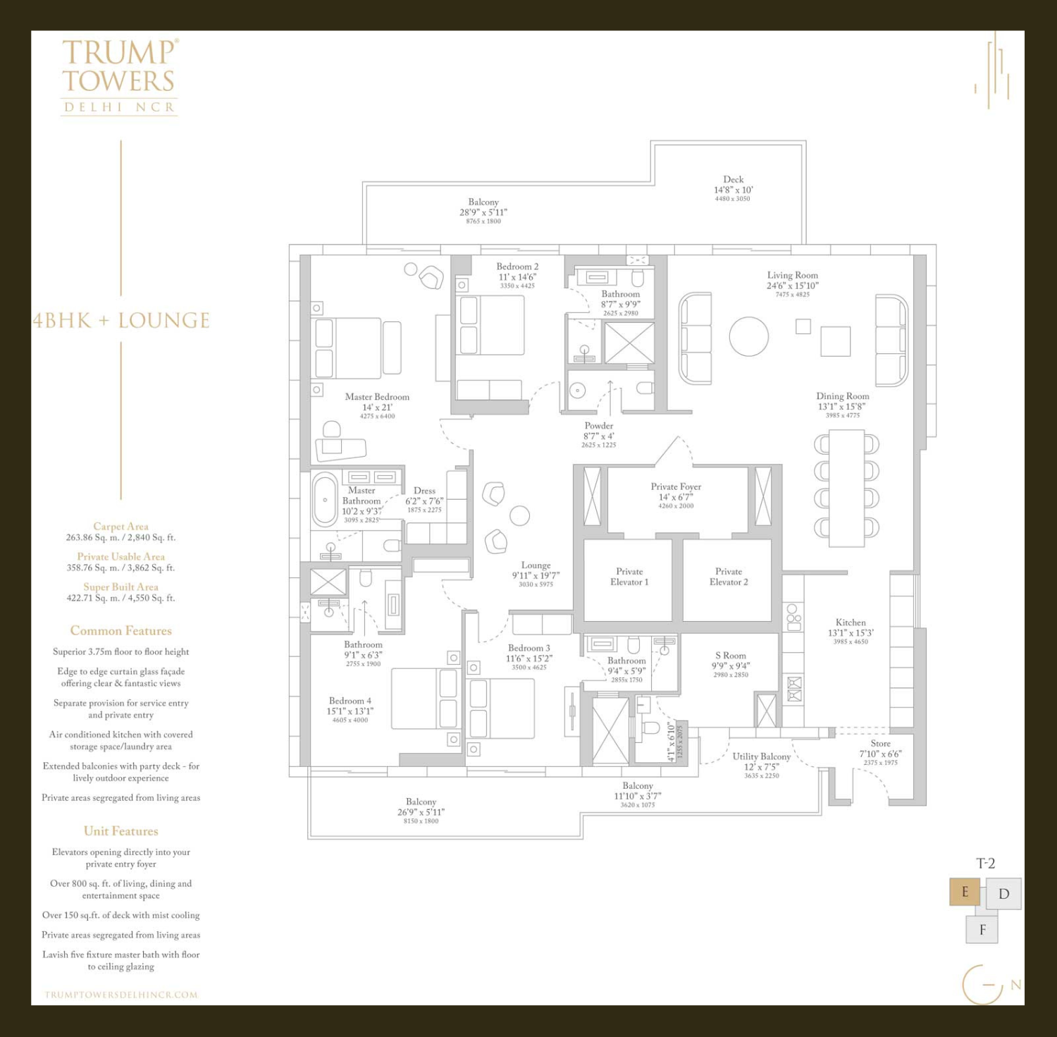 Set across a prime land parcel along SPR, Trump Tower 2 features two iconic 51-storey towers housing 298 exclusive residences, making it one of the most limited-inventory luxury skyscrapers in the region. The development offers expansive 3 BHK and 4 BHK residences, with sizes ranging from approximately 3,100 sq ft to nearly 5,000 sq ft, thoughtfully designed with signature Trump-branded aesthetics, double-height living areas in select units, private elevators, panoramic floor-to-ceiling glazing, and ultra-premium imported finishes.